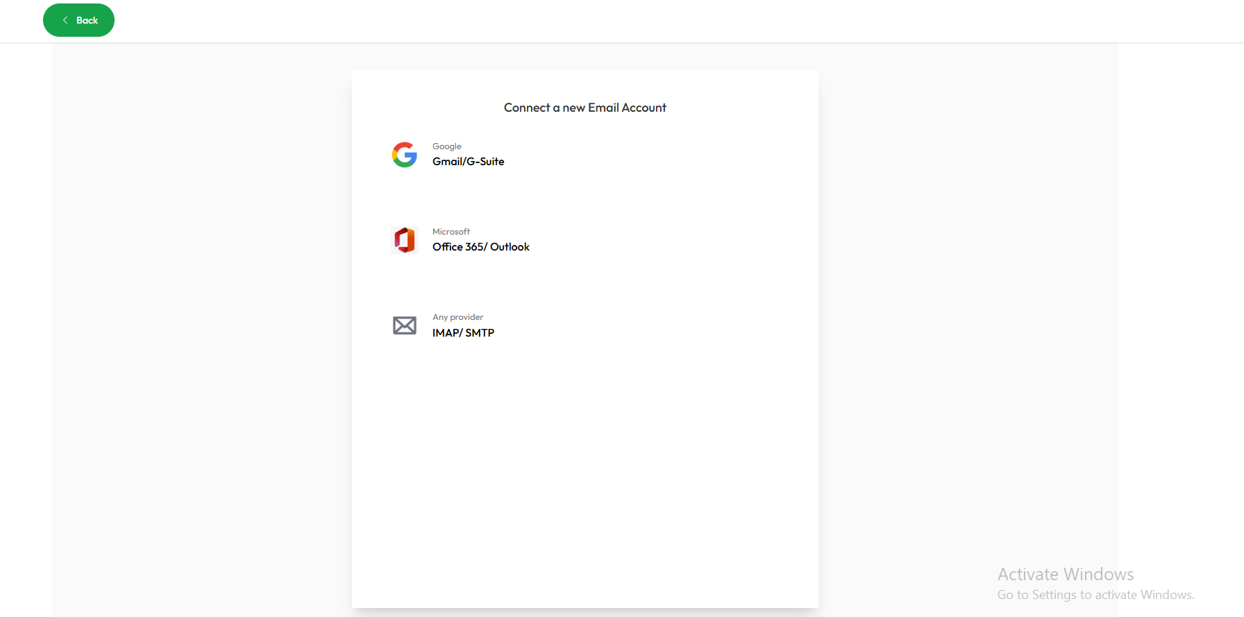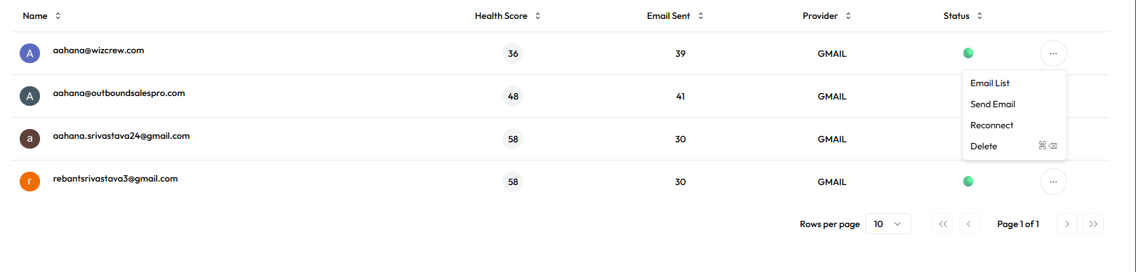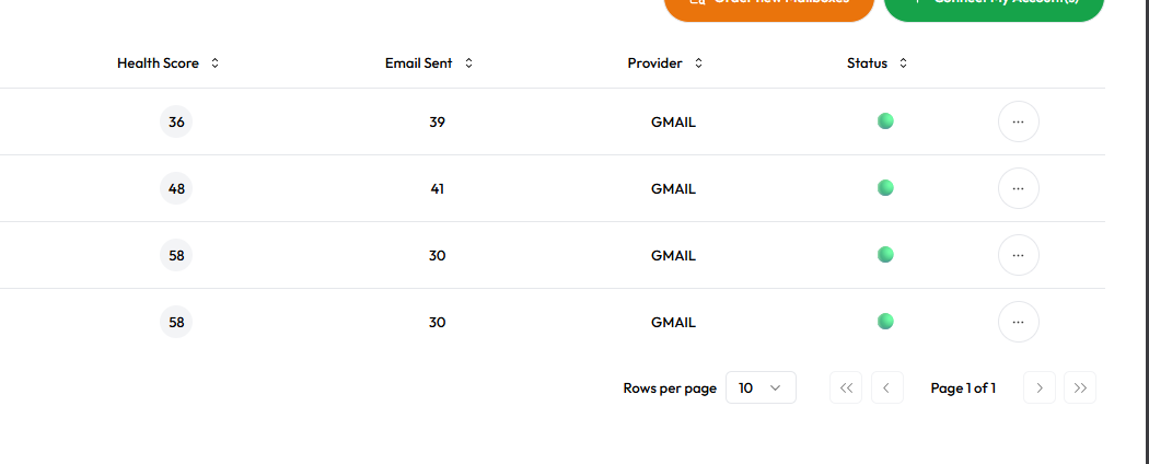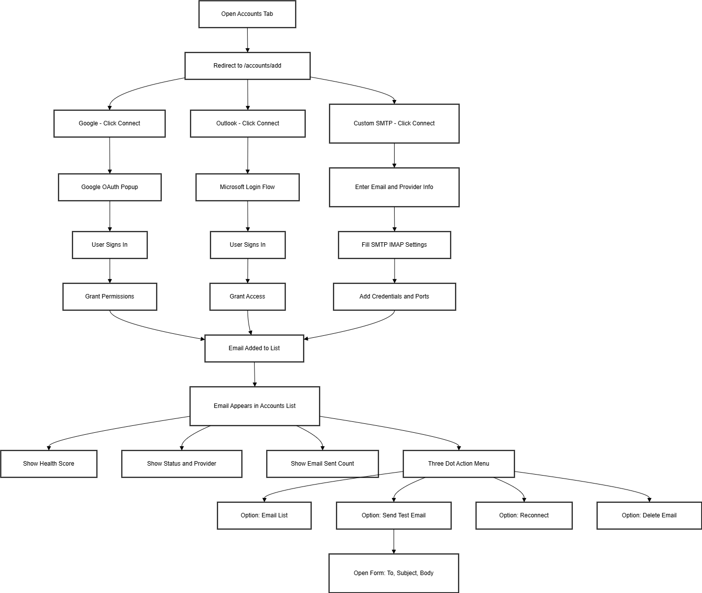 This flow allows users to connect or purchase sending email accounts for use in cold outreach. It supports Gmail, Outlook, and custom IMAP/SMTP providers. Once connected, all accounts appear in a centralized list with metadata and action options.