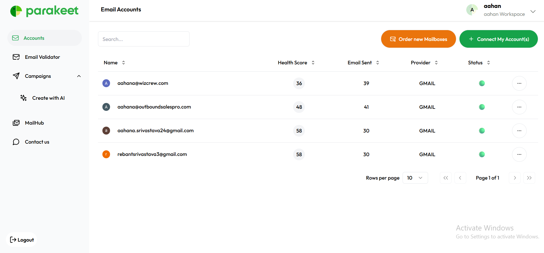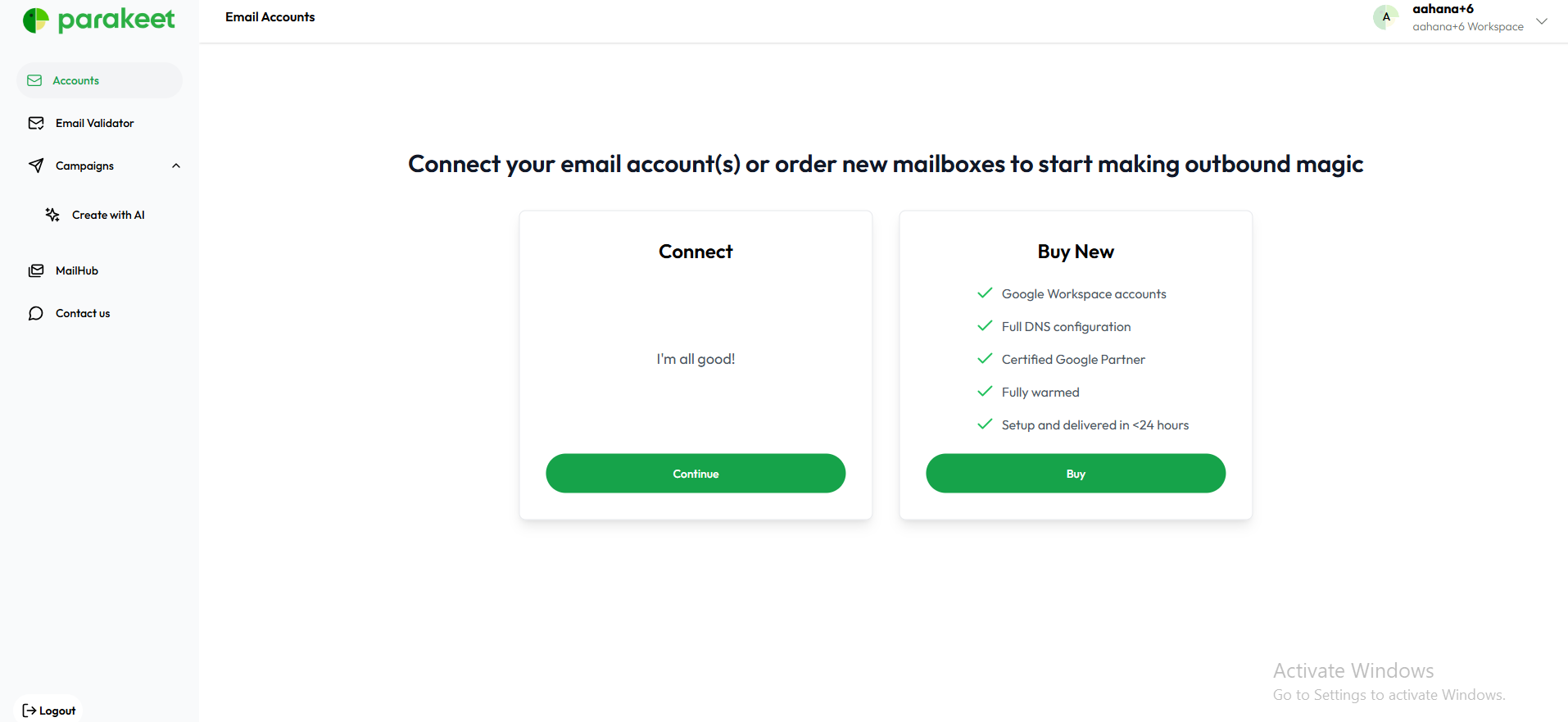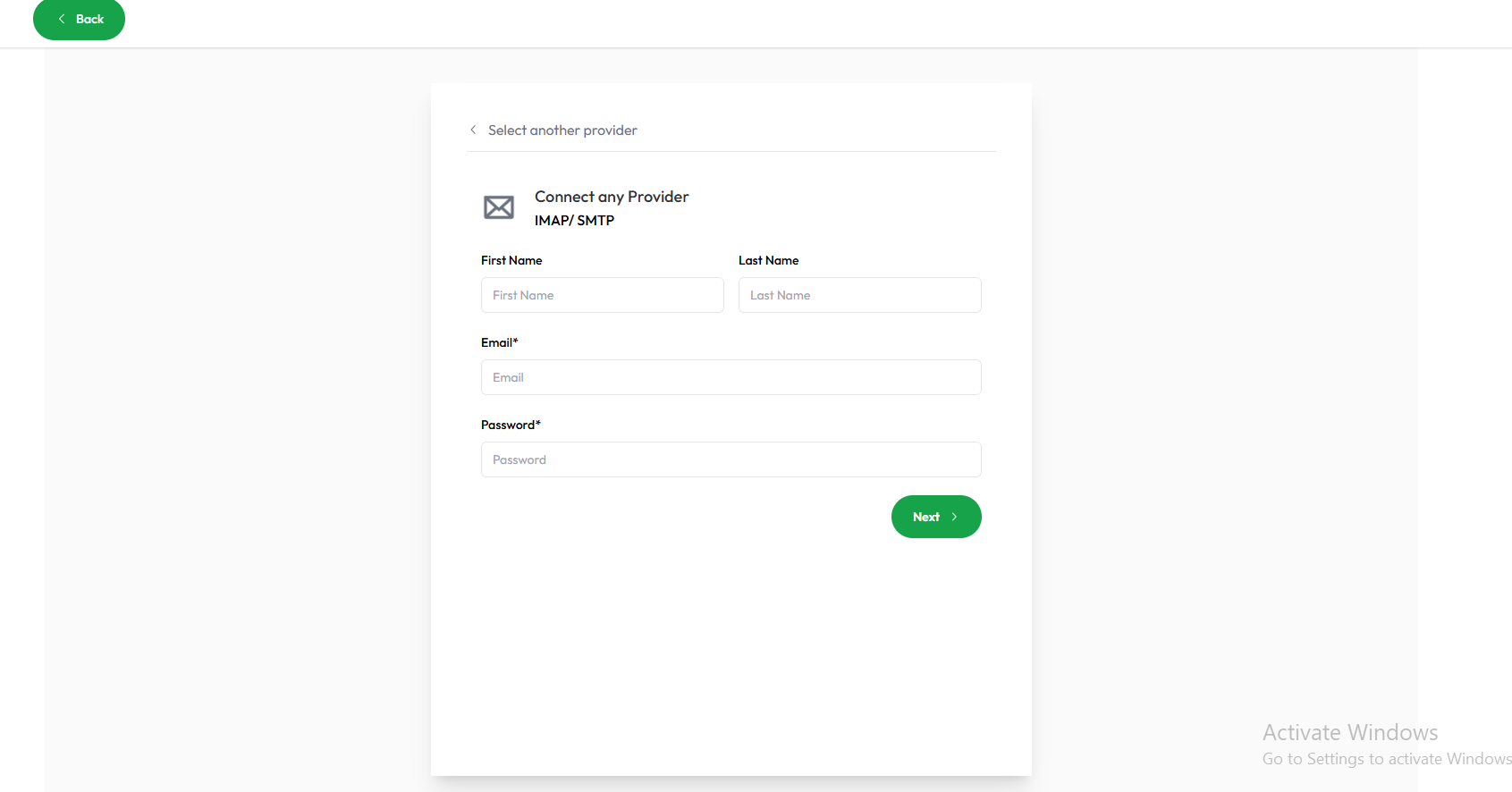 This flow allows users to connect or purchase sending email accounts for use in cold outreach. It supports Gmail, Outlook, and custom IMAP/SMTP providers. Once connected, all accounts appear in a centralized list with metadata and action options.