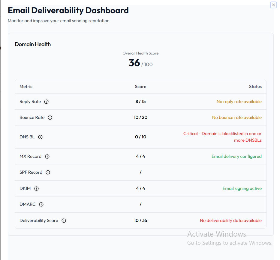Clicking on the Health Score opens the Email Deliverability Dashboard, which evaluates the domain’s ability to successfully deliver emails based on the following metrics: