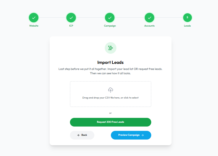 | 5 | Import Leads | Upload a CSV of leads or request free leads for campaign execution |