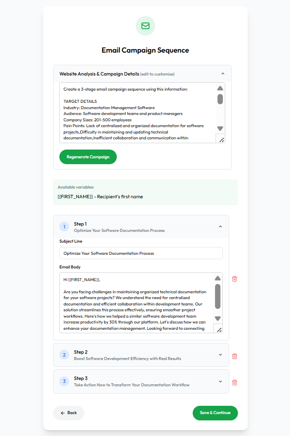 | 3 | Review AI Website Summary & Campaign | See AI-generated campaign draft and variables |