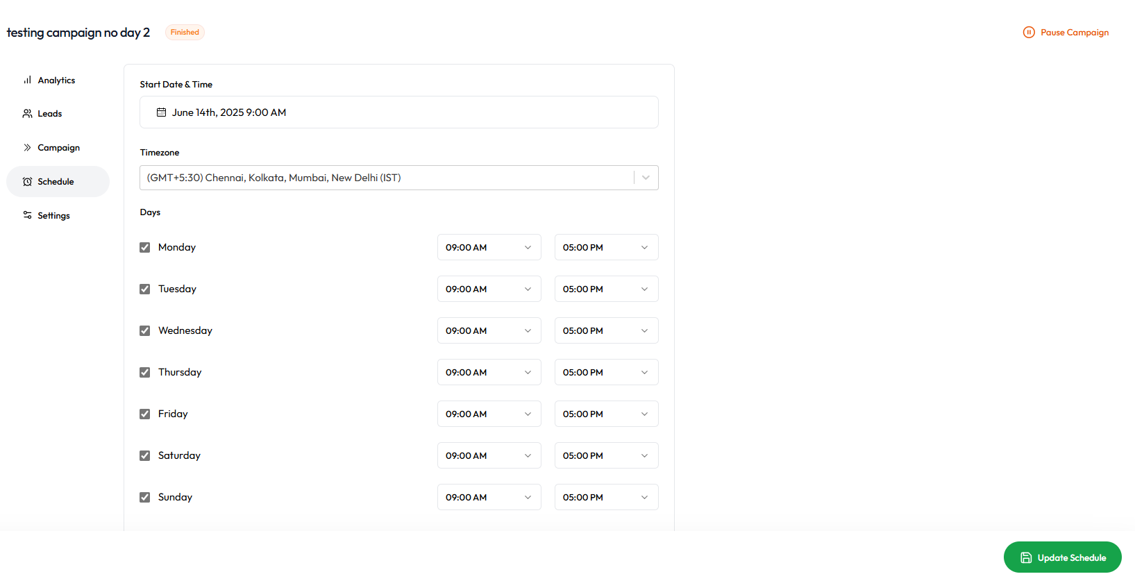Sending Hours: Default window is 9 AM–5 PM. Fully customizable.