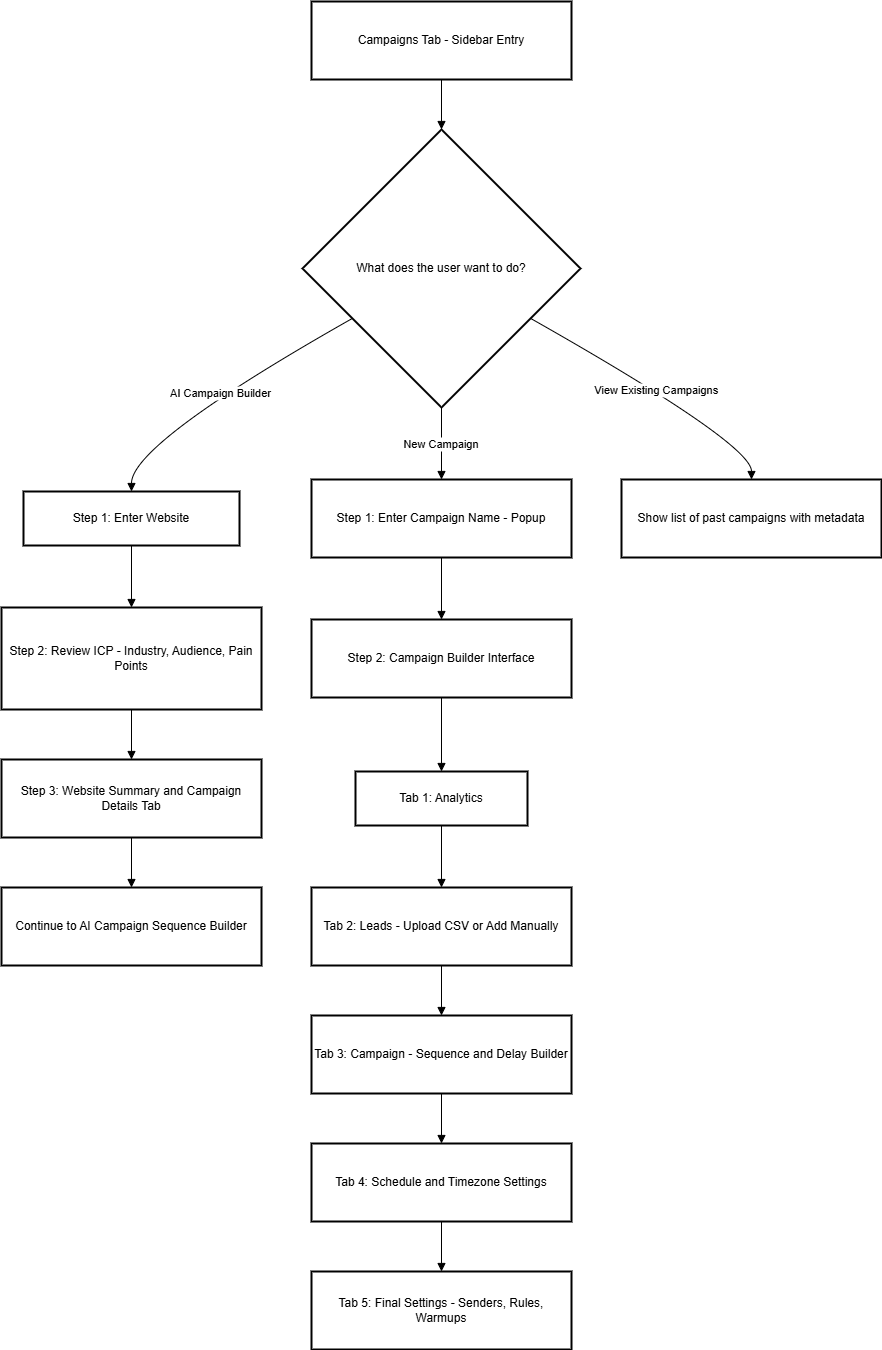 | Create new AI campaign | Follows website → ICP → campaign builder flow |
