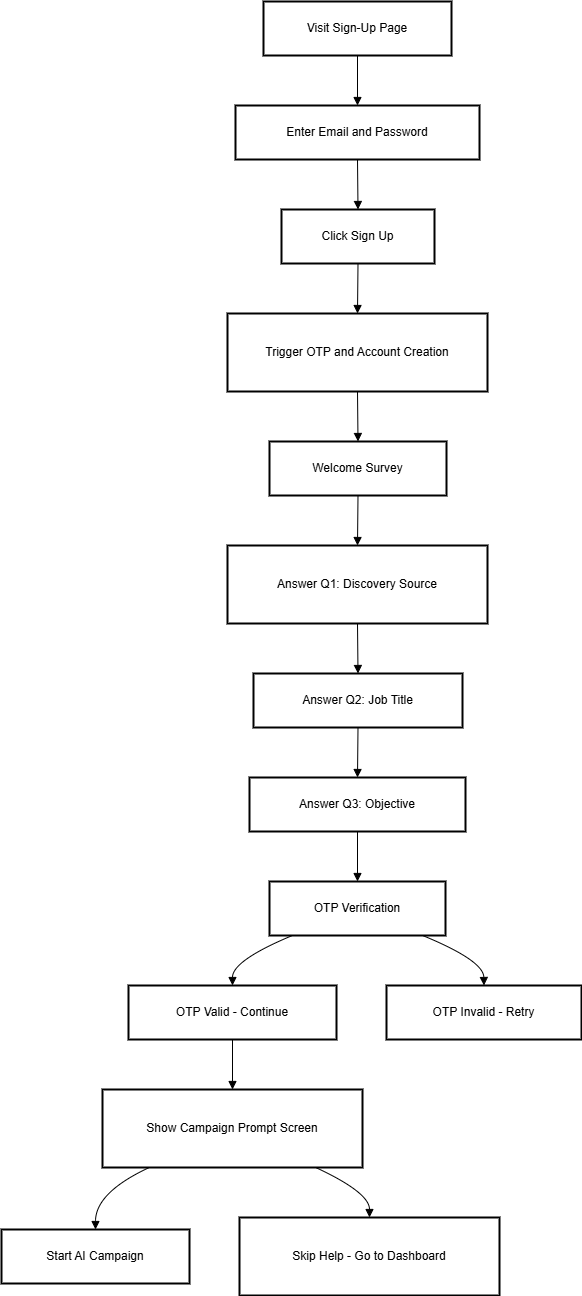 The sign-up flow registers new users and initiates a personalized onboarding sequence, guiding them toward setting up their first campaign effectively.